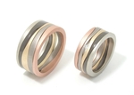 2006Ringen gemaakt van zirconium, titanium, geel-, rood- en witgoud. Herenring 10 mm. breed. Damesring 8 mm. breed bezet met een diamant van 0,04 ct. Set als getoond E2750,=.